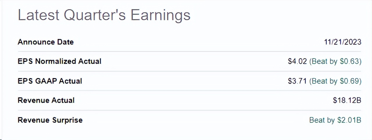 英偉達(NASDAQ:NVDA )公佈了強勁的 2024 財年第三季度收益。該季度 GAAP 攤薄後每股收益為 3.71 美元,較去年同期增長逾 12 倍,非 GAAP 攤薄每股收益為 4.02 美元,較去年同期增長近 6 倍。每股收益 4.02 美元(超出預期 0.63 美元)。該公司實現創紀錄的 181.2 億美元營收(超出市場預期 20.1 億美元),較上年大幅增長 206%,環比增長 34%。