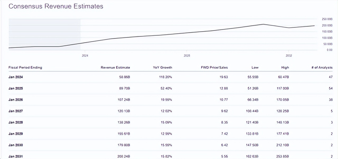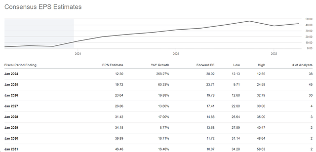 花旗分析師 Atif Malik 指出,由於同比比較具有挑戰性,特別是在數據中心領域,該股可能會“區間波動”。這種説法聽起來很合乎邏輯,因為在公司經營指標強勁增長後,將很難再出現類似的同比和環比勢頭。然而,對我來説似乎顯而易見的事情對於華爾街的共識來説似乎並非如此,華爾街的共識預計 2025 財年每股收益將實現 60.33% 的驚人增長,並且在未來 7 年 [2025-2031 財年] 的複合年增長率約為 13%。