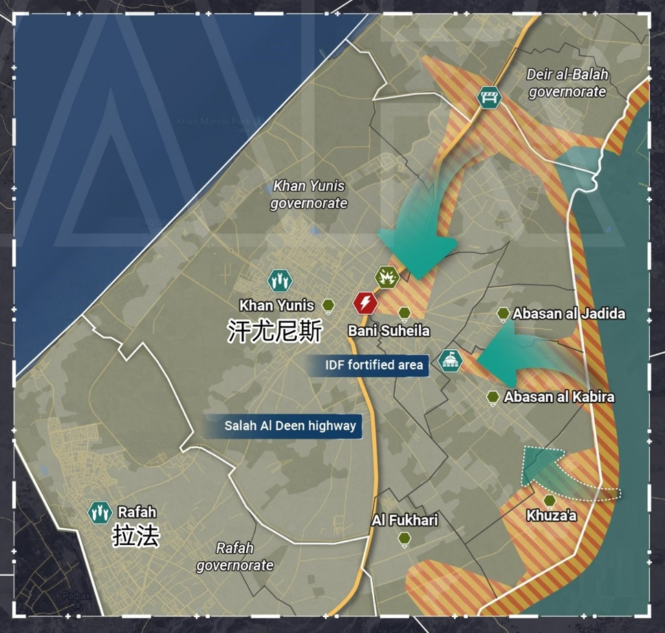 其一是宣佈以色列軍隊打到了汗尤尼斯的市中心,但是我看了一下Rybar發佈的戰區態勢圖,以色列軍隊的態勢和加沙北部似乎沒有任何區別,連戰法都一模一樣。首先從汗尤尼斯北邊的Al-Ma’an地區橫切一刀,把加沙地帶南北的薩拉丁大道給攔腰斬斷,然後沿着薩拉丁大道往汗尤尼斯市區裏邊衝。