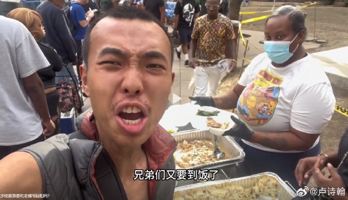 丁胖子講師實際拍攝的是,美國連底層的流浪漢都能領到救濟漢堡救濟炸雞,美國還不夠強大嗎?