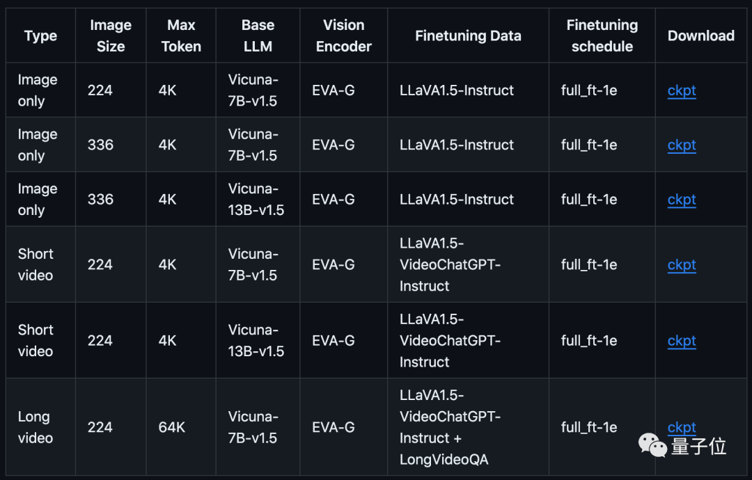具體訓練包括3個過程:特徵對齊、指令微調、長視頻微調(相應步驟可參考GitHub)。