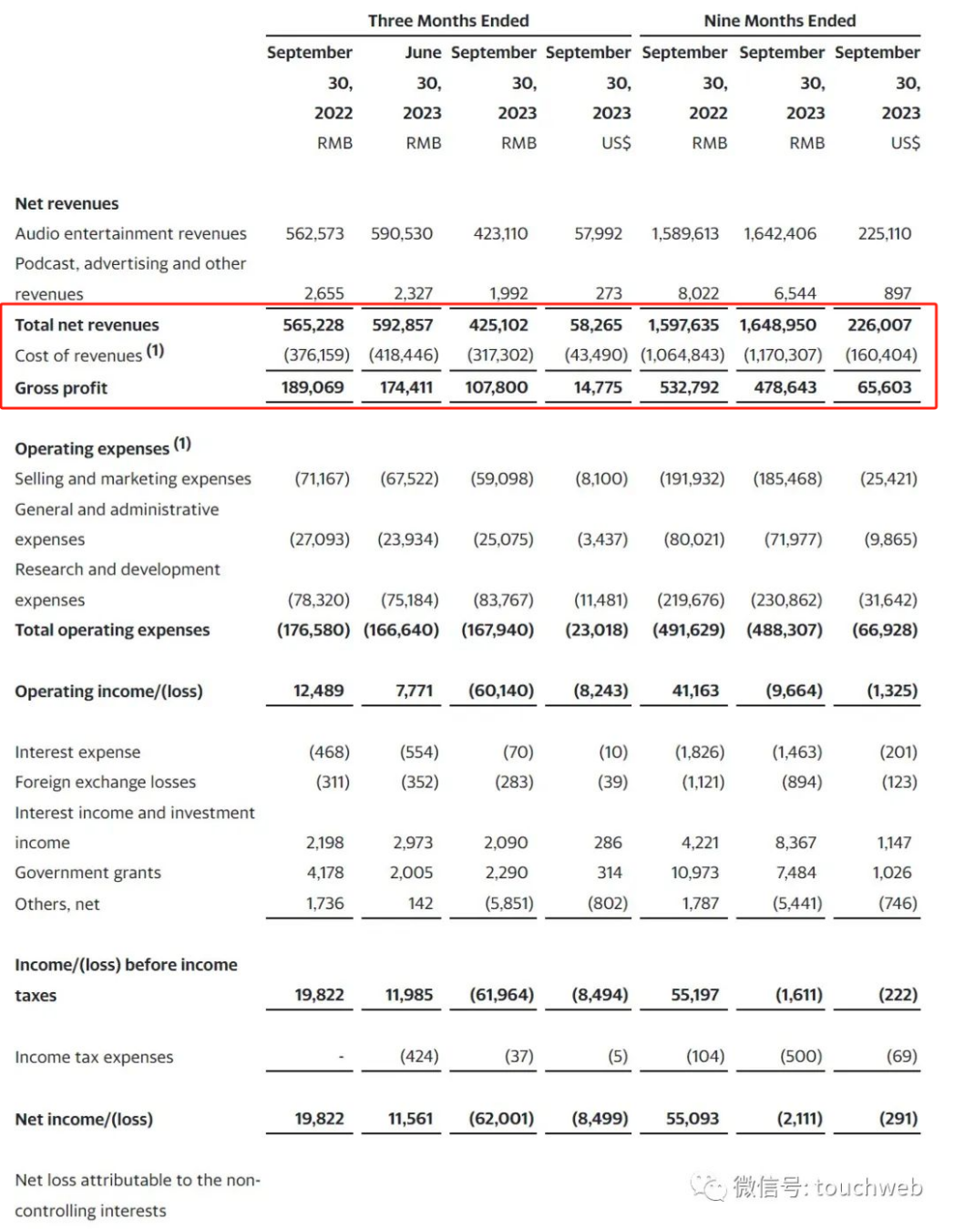 財報數據顯示,荔枝2023年第三季度毛利率為25%,毛利為1.08億元,2022年同期的毛利為1.89億元。儘管毛利同比基本持平,但三季度荔枝同比出現淨虧損,累計為6200萬元。