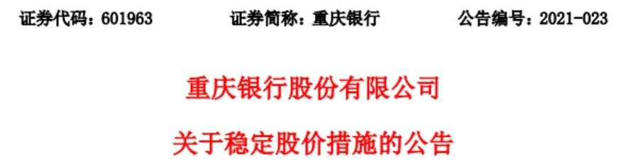 2021年8月,重慶銀行發佈關於穩定股價措施的公告,根據穩定股價預案,擬採取由現任非獨立董事、高級管理人員、第一大股東增持股份的措施穩定股價,增持金額合計不低於 2659.76萬元,其中第一大股東重慶渝富增持金額不低於 2585.90萬元。