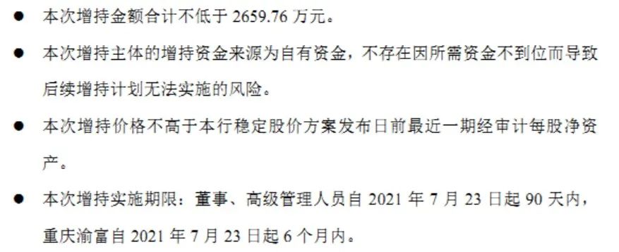 當年7月,重慶銀行宣佈上述穩定股價措施完成,累計增持金額 2664.10 萬元,成交價格區間為每股 7.56元-8.93元。