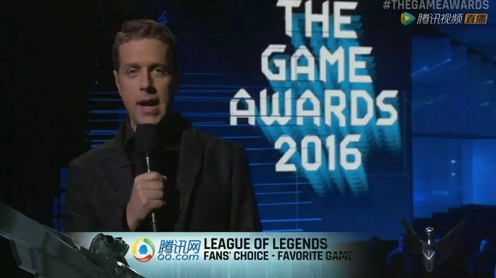 (2016 年 TGA 上,主持人口播了《英雄聯盟》獲得「粉絲選擇獎」的消息)