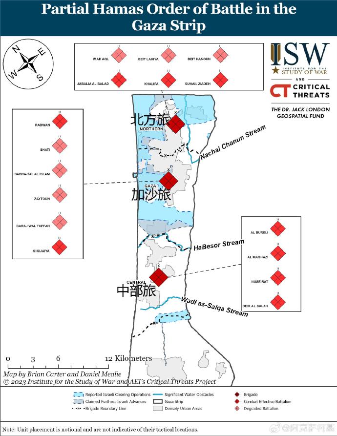 ISW評估哈馬斯中北部三個旅的19個營中至少有7個營已經被打殘,並且有6個營正在承受着以色列國防軍的巨大壓力。而南部兩個哈馬斯旅的一兩個營目前正在承受以軍壓力。