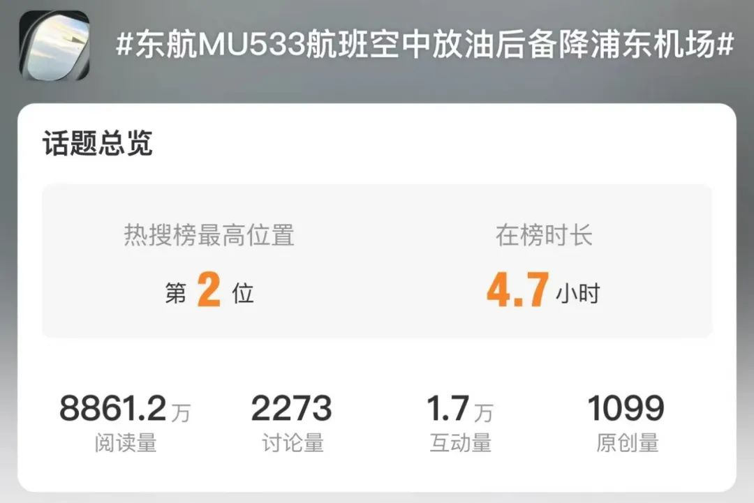 12月9號,東航原計劃由上海浦東飛往倫敦的MU533航班,由於機械故障原因,空中放油後返航上海浦東。一時間又登上了微博熱搜。