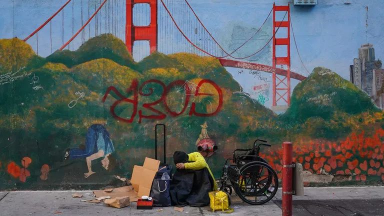 ▲2023年11月,舊金山市中心,一名無家可歸者坐在 APEC 峯會總部附近金門大橋的壁畫前。
