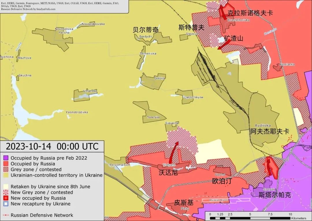 俄軍的戰役意圖,目前看是在三個戰術方向上推進:北部在拿下礦渣山後,試圖向西推過鐵路線,拿下斯特普夫和別爾蒂奇,目前正在和烏軍在斯特普夫一線激戰,大概是上週二左右的消息是俄軍正在對斯特普夫展開最後的清剿,但目前還沒有拿下的消息傳來;中部俄軍則在阿夫傑耶夫卡的城市圍廓上推進,一路俄軍的戰術方向是礦渣山以南的別墅區,意圖抵近阿夫傑耶夫卡中部。另一路俄軍的戰術方向則是阿夫傑耶夫卡南部的工業區和礦場,目前這兩個重要支撐點已經被俄軍拿下,這為俄軍正式對阿夫傑耶夫卡南部城區展開進攻掃清了道路;南部俄軍則從歐泊汀和沃達尼出發,目標是阿夫傑耶夫卡西部的重要支撐點Sjeverne,南北兩路俄軍的行動形成策應,奪下斯特普夫和Sjeverne之後,阿夫傑耶夫卡的烏軍將被整體關門,包圍圈的距離縮小到僅有6千米左右,使用任何直射武器都可以實施火力封鎖,阿夫傑耶夫卡的防禦也將失去意義。