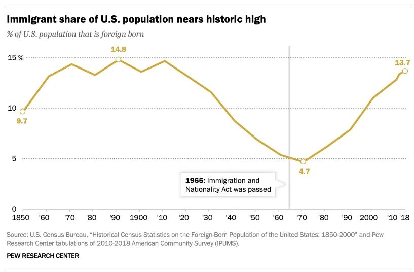 可實際上,從20世紀初到滯脹危機,美國工業能力最強、藍領一人工作養活全家的60多年,**也是美國最不歡迎移民的60年。**只有在早期狂野發展的工廠和種植園裏,以及80年代後大量低端服務業的崗位上,美國才對潤人張開懷抱,保證他們有機會作為廉價勞動力,為本地中上層的美國夢而辛勤努力。