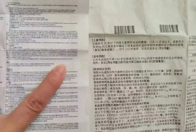 瑪巴洛沙韋片的藥品説明書大得像一張地圖;放在一起看的話,阿奇黴素的藥品説明書就像塊豆腐乾一樣了,而且由於內容太多,上面密密麻麻的,字小到讓人眼暈。