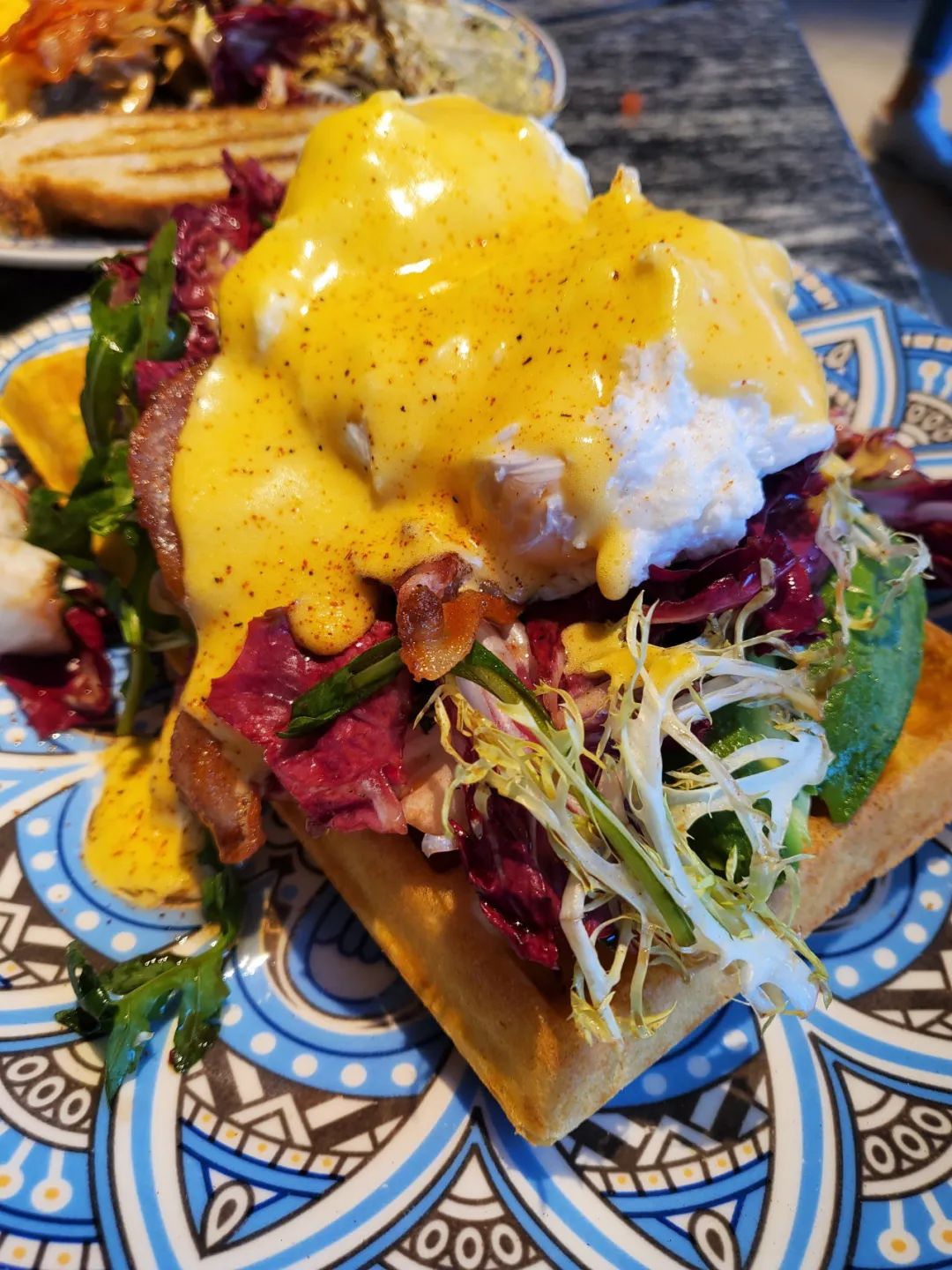 華夫餅班尼迪克特(Waffle Benedict),用華夫餅取代了傳統的英式鬆餅,上面放上水煮蛋和荷蘭醬。