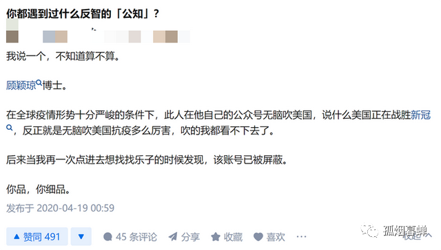 ?”這個大話題的討論區下面,另一位網友也提到了顧博士,並對他作出了這樣的評價:在全球疫情形勢異常嚴峻的情況下,此人在他自己的公眾號無腦猛吹美國,説什麼美國“正在戰勝新冠”,各種無腦亂吹,美其名曰“美國抗疫多麼多麼厲害”,吹得我最後都看不下去了。後來,當我再一次點進去他的公眾號,想要找點樂子的時候,我卻意外發現,他的賬號已經被屏蔽了。你品,你細品。