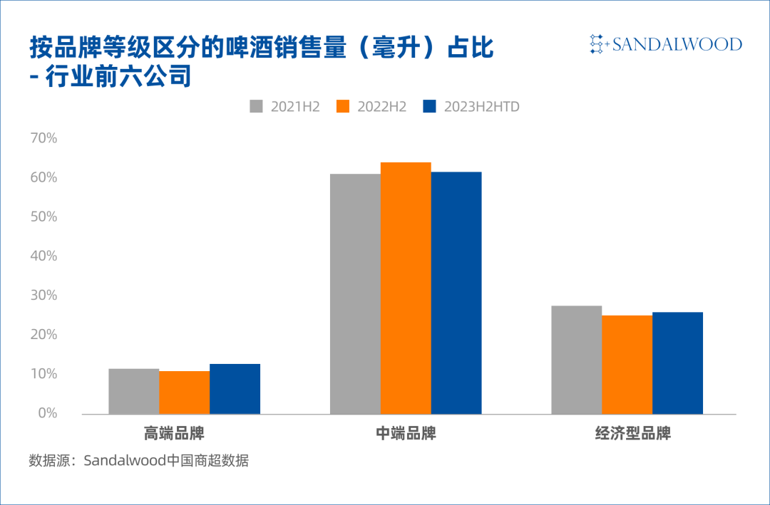 **啤酒:**啤酒行業在2013年後便已進入存量競爭時代,近年來更是步入結構升級階段。龍頭企業紛紛發力中高端啤酒,以滿足消費者對口感和品質的追求。Sandalwood中國商超數據顯示,近三年來,啤酒行業平均銷售單價持續正增長,且銷量份額於2022年下半年自經濟型品牌向中端品牌轉移,再於2023年同期向高端品牌轉移。