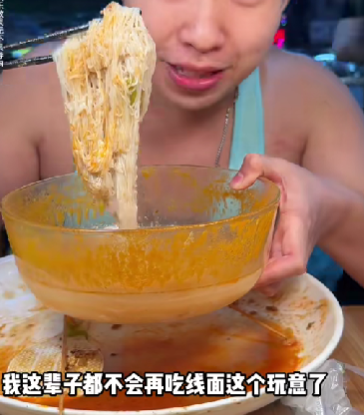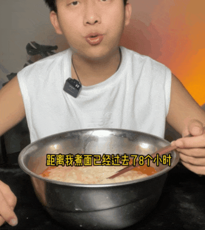 在一個博主的挑戰視頻裏,他一次性將8捆線面倒進鍋中。經歷了至少三次中場休息,歷經11個小時都沒能吃完那盆線面。