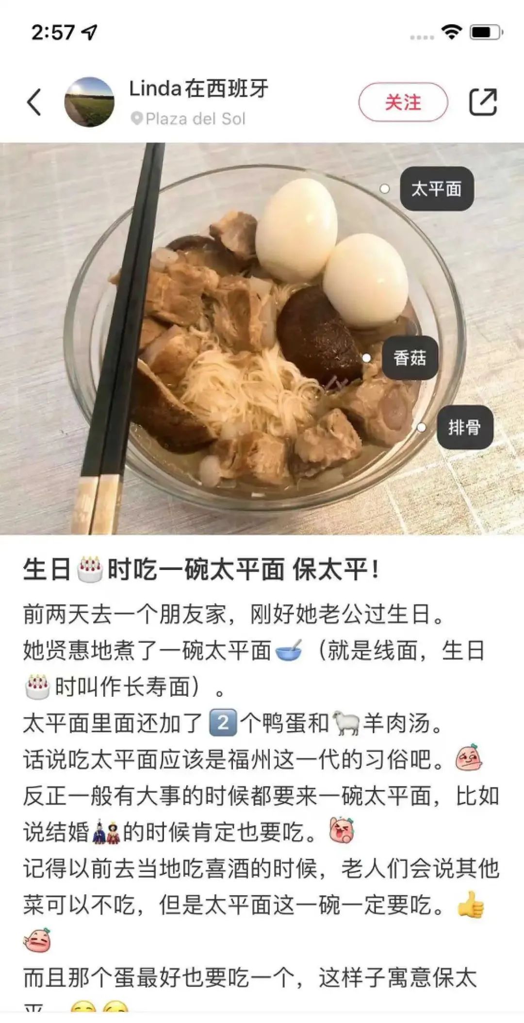 姚晨作為福建人對此非常有發言權。參加《親愛的客棧》時她提到,每次年關奶奶做的團圓飯一定少不了一碗水鴨湯線面,裏面一定會加兩顆平安蛋。