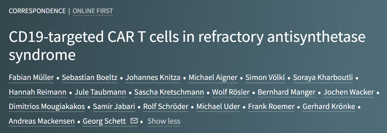 2023年2月,Georg Schett 團隊等人在《柳葉刀》發表臨牀研究論文,使用CAR-T細胞療法成功治療了一種新的自身免疫疾病——特發性炎性肌病。
