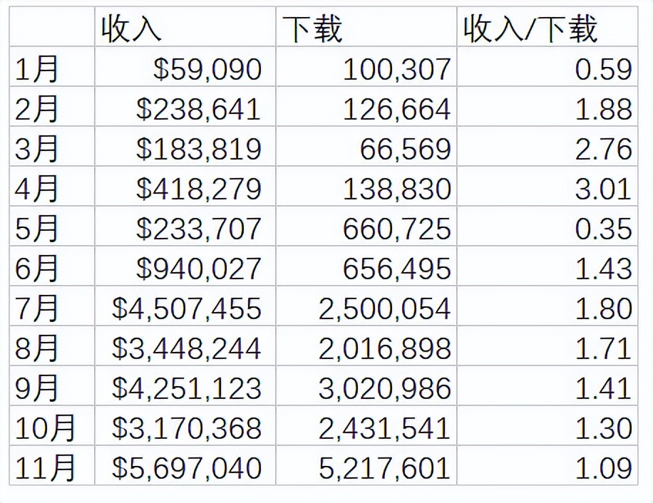 目前來看,隨着越來越多的玩家湧入,已變成紅海市場的短劇也出現了ROI降低的情況。以ReelShort為例,自7月份以來,ReelShort的收入下載比一直是持續下降的趨勢,其收入下載比已從7月的1.8降低到11月的1.09。這意味着,同樣的用户下載量,換取的用户收入越來越少。