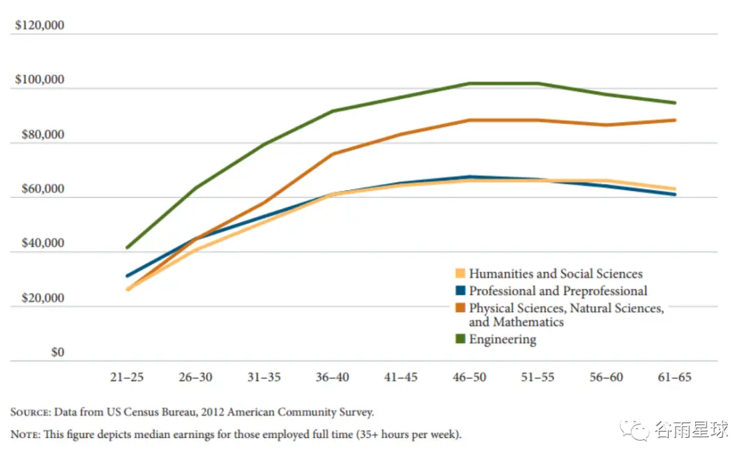 人文學科與理工畢業生的收入中位數差距隨着工作年限的增加而增加,而在職業中期的收入最高峯,工科畢業生的平均年薪達到了人文學科的1.5倍。