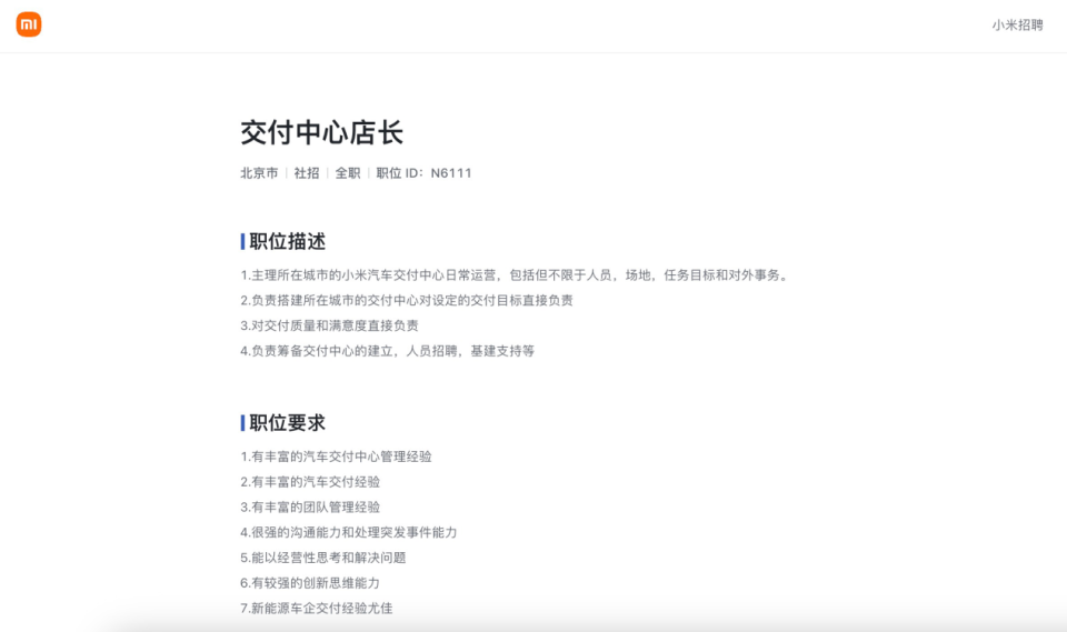 在員工層面,小米汽車已在北京、天津、石家莊等多地公開小米汽車門店店長、新能源汽車銷售主管、零售市場經理等崗位的招聘,多個崗位要求有汽車銷售經驗、擁有有效汽車駕照等。其中,小米汽車門店店長等部分崗位還需要有搭建銷售團隊、管理團隊等能力。薪資方面,上述崗位薪資達到15000-30000元。