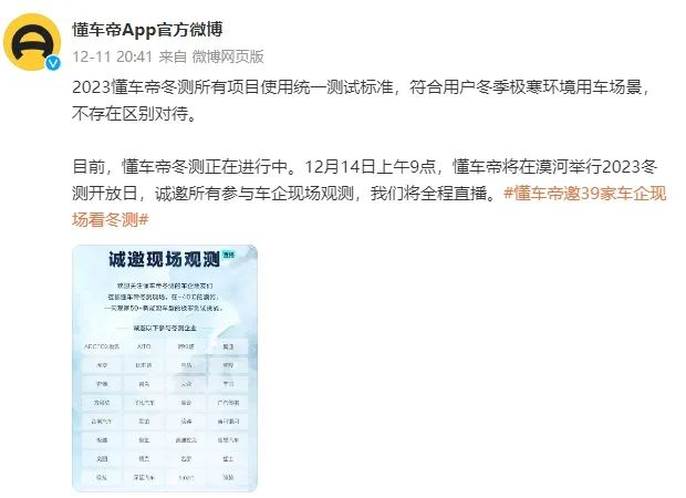 當下,懂車帝和車廠之間的口水仗仍在繼續,雙方均表示將通過更多事實和證據證明自己。12月14日,懂車帝將在漠河舉行2023冬測開放日,邀請39家車企現場觀測,邀約名單中包括問界、長城、吉利這幾家提出質疑的車企。