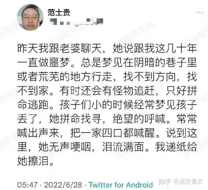 而範士貴的老婆自從嫁給他後,這幾十年來一直擔驚受怕,雖然痛苦不堪但一直無怨無悔的跟着他。