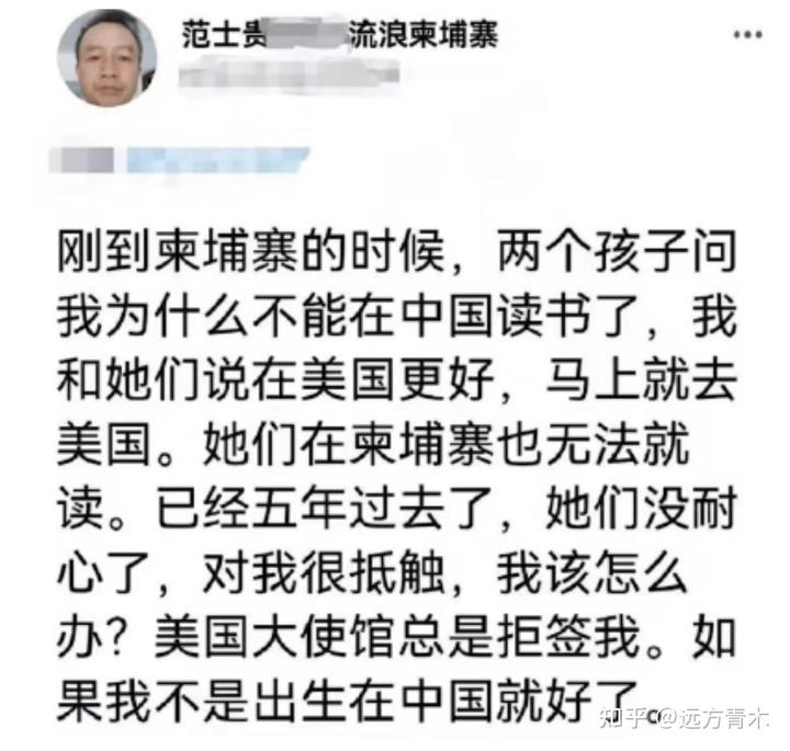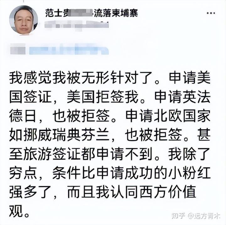 因為範士貴有一種極為奇怪的思維,他認為歐美拒籤他並不是自己的錯,也不是歐美聖人的錯,拒籤的真實原因是自己是中國人,自己生活在中國的土地上。
