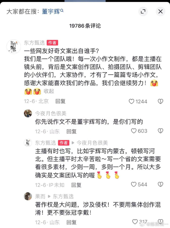 2、“小作文”全部由董宇輝一個人撰寫的言論是有些偏激,這種説法否認了其他主播和幕後團隊創作的努力和貢獻。(沒見過其他網紅大博主的幕後團隊出來邀功的,孫老師您醒醒)