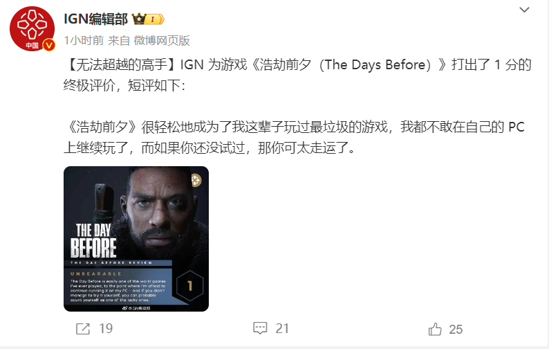 就在這個月 12 號,遊戲媒體 IGN 給予了遊戲相當中肯的評價:一分( 滿分十分 )。