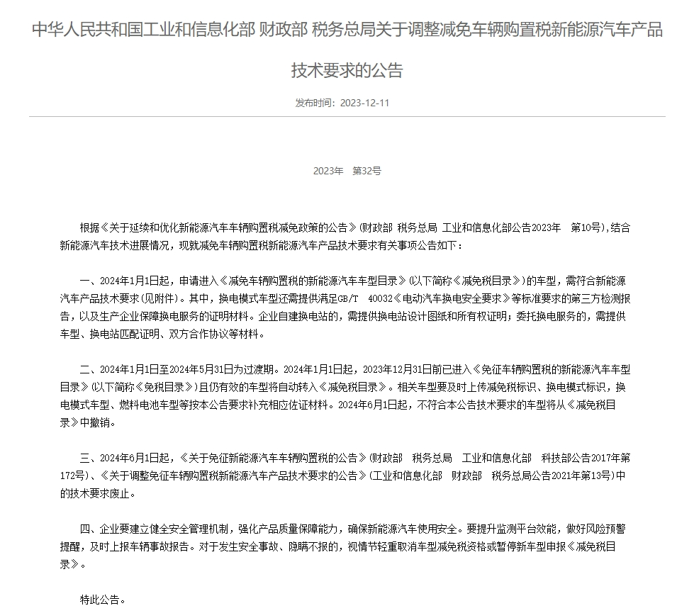 12月11日,工信部發布了《關於調整減免車輛購置税新能源汽車產品技術要求的公告》(以下簡稱《公告》),其中明確了2024年後新能源汽車減免車輛購置税政策適用的技術條件和執行要求。