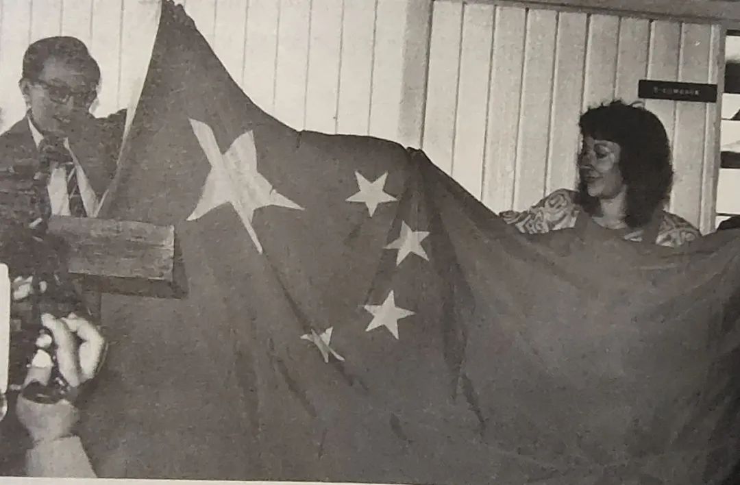 在“長江小學”成立大會上,作者(左)與校長一起展示中華人民共和國國旗。