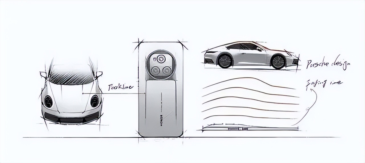 在雙方宣佈合作後不久,網上就傳出一張設計師手稿圖,來自榮耀 Magic6 保時捷版。這張圖顯示,榮耀新機背部融入保時捷 911 跑車的線條,榮耀以及保時捷設計logo 呈豎向排列,可以説,這就是“保時捷的手機形態”,擁有大量的保時捷“靈魂”設計元素。
