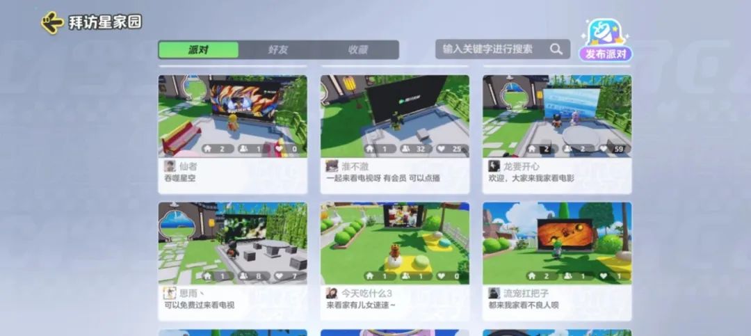 今日遊戲上線後,大受好評的騰訊視頻、QQ音樂等功能元件也成為了派對互動的熱門內容。玩家們紛紛在家園裏開起了錄像廳、電影院、演唱會。
