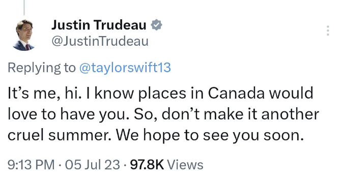 △加拿大總理特魯多親自邀請泰勒前往加拿大巡演(圖源:社交媒體)