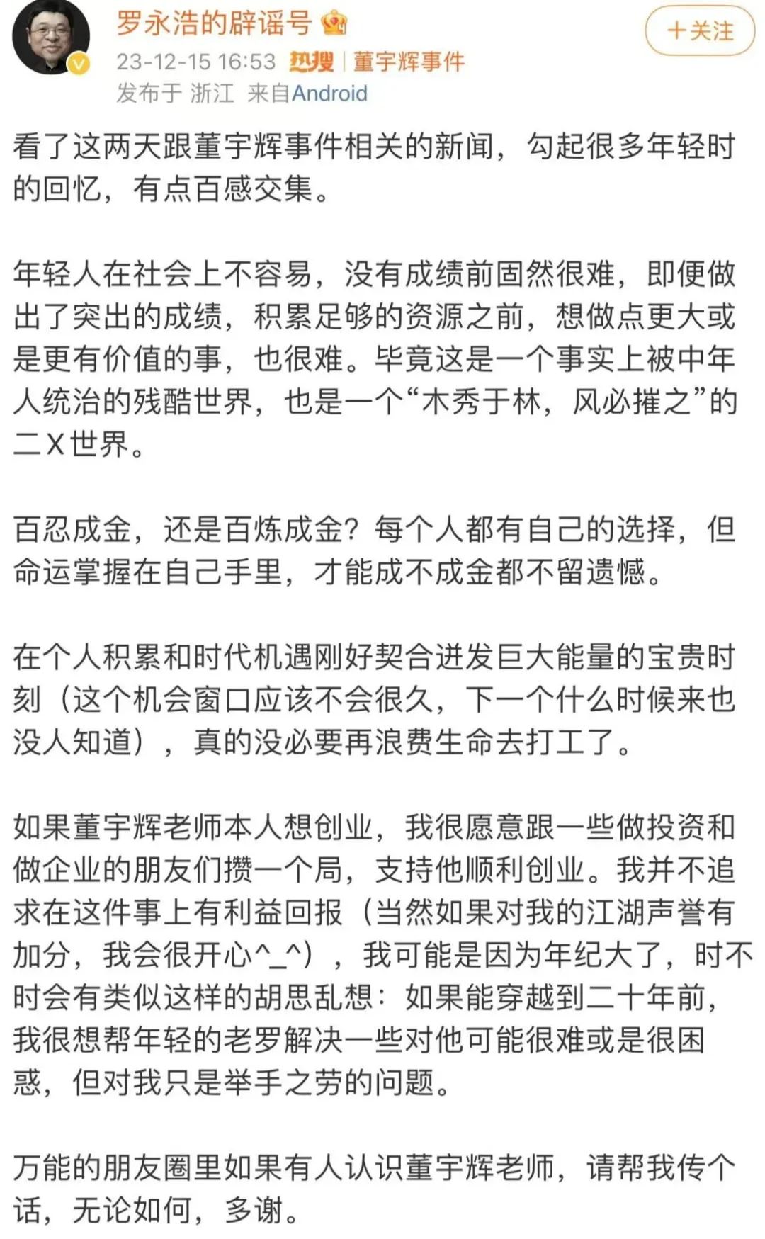 另外,12月15日下午,羅永浩發佈消息稱,“如果董宇輝老師本人想創業,我很願意跟一些做投資和做企業的朋友們攢一個局,支持他順利創業。萬能的朋友圈裏如果有人認識董宇輝老師,請幫我傳個話,無論如何,多謝。”