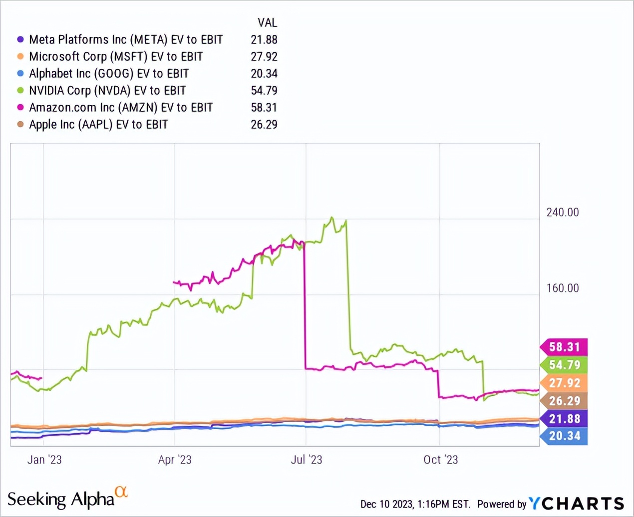 我總是採用 EV/EBIT 倍數而不是市盈率,因為我們可以通過使用企業價值來包含債務。在這裏我們可以看到 Meta 和谷歌是同行中最便宜的。可能是因為有些人將人工智能視為對搜索引擎業務的威脅,而 Meta 擁有許多人不喜歡的元宇宙。此外,TikTok也對Meta的估值產生影響。