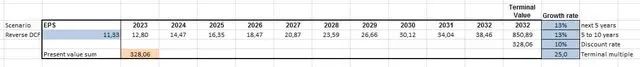 如果我們將這個數字放入反向貼現現金流(DCF)中,看看股票的定價,我們可以看到 EPS 目前的定價在未來 10 年的複合年增長率約為 13% 。過去10年,Meta實現了40.15%的年複合增長率,遠高於所需的增長率。然而,過去5年的增長率“僅為”11.25%,低於要求的水平。