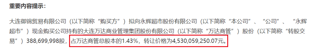 12月13日晚間,永輝超市發佈公告稱,大連御錦貿易擬向永輝超市現金購買公司持有的大連萬達商管1.43%股份,轉讓價格為45.30億元。對此,永輝超市解釋是為了盤活公司資產,符合公司縮小投資規模戰略。