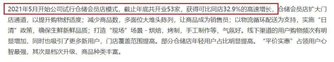 例如,2021年5月,永輝超市開始試行倉儲會員店模式。2021年財報顯示,截止年底,倉儲會員店共開業53家,獲得可比同店32.9%的高速增長。但到了2022年財報時,關於倉儲會員店進展的表述已經消失不見。