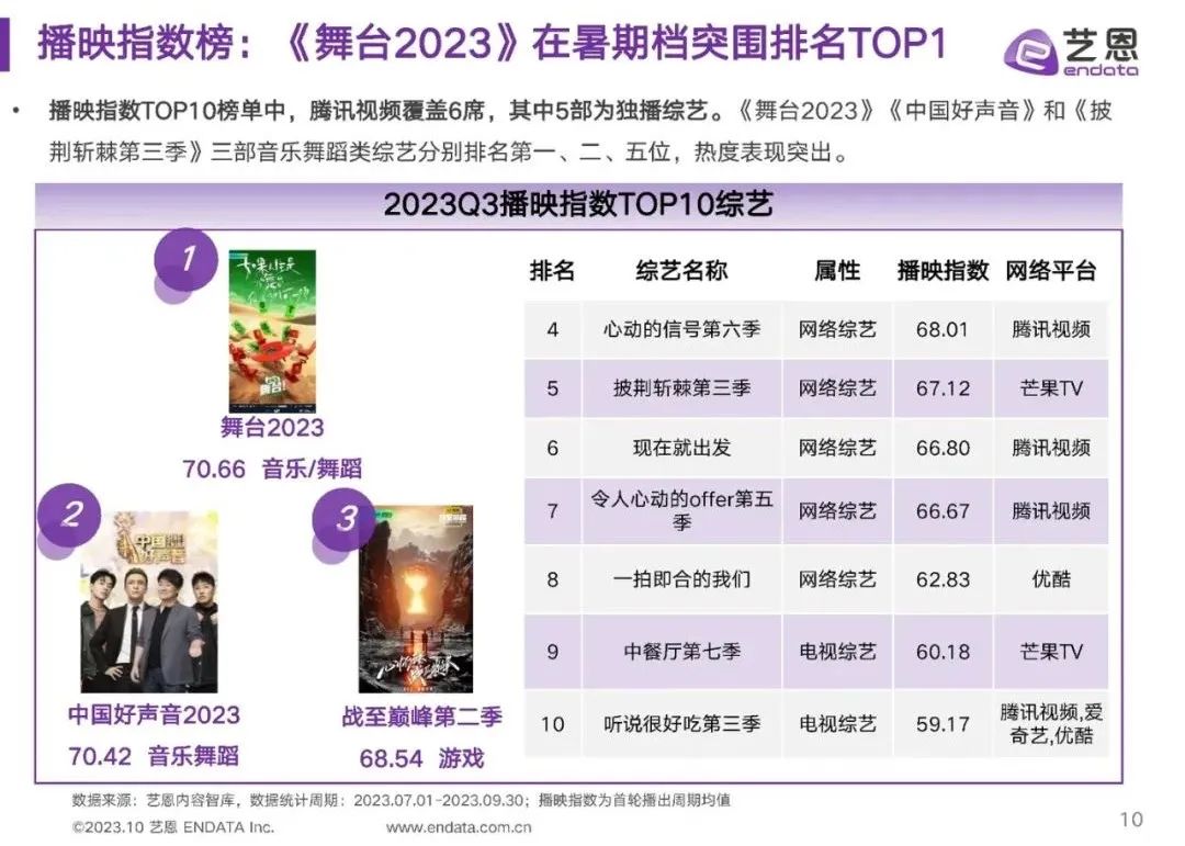 上線數量代表着視頻平台和衞視對綜藝市場的信心,而播映指數體現的是觀眾對綜藝內容的積極反饋,雙維度數據疊加,印證了2023年綜藝仍是一個高活性與高價值內容賽道。值得注意的是,前三季度TOP10綜藝播映指數的提升,也意味着2023年頭部綜藝走出了疲軟之勢,市場爆款孵化能力進一步提升。