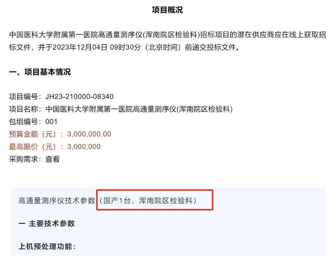 「界面新聞·子彈財經」記者翻看最近的招標公告發現,遼寧省政府採購中心發佈【中國醫科大學附屬第一醫院高通量基因測序儀(渾南院區檢驗科)】的招標公告,明確要求是國產。