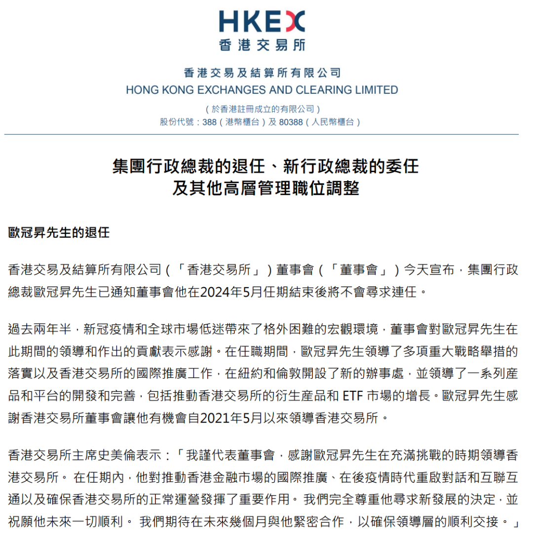 過去兩年半,新冠疫情和全球市場低迷帶來了格外困難的宏觀環境,港交所董事會對歐冠升在此期間的領導和作出的貢獻表示感謝。在任職期間,歐冠升領導了多項重大戰略舉措的落實以及港交所的國際推廣工作,在紐約和倫敦開設了新的辦事處,並領導了一系列產品和平台的開發和完善,包括推動港交所的衍生產品和ETF市場的增長。