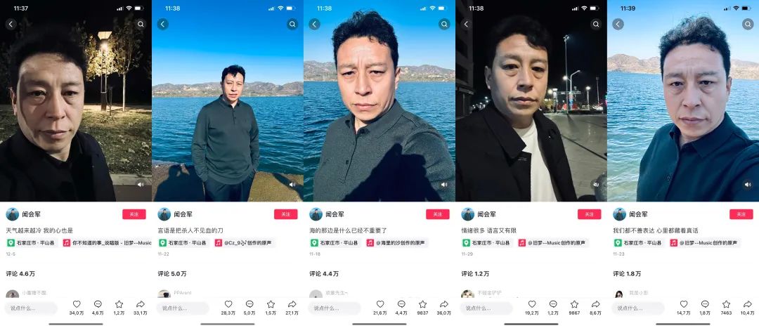 但我們關注聞會軍大叔的意義,不在於他的走紅是不是靠團隊運作才能實現的,而是因為他之所以能走紅,更多時候是對抖音創作者羣體中普遍存在的套路化、格式化、模塊化的“流量密碼”予以了否認。