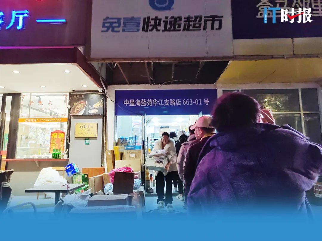 12月13日晚上8:30,位於華江支路的快遞驛站門前,來取包裹的市民陸續排起了長隊。驛站內,工作人員凌弘(化名)和他的父親、舅舅正在忙活着。有的包裹在站內已無“立足之地”,被整齊地放置在門外。