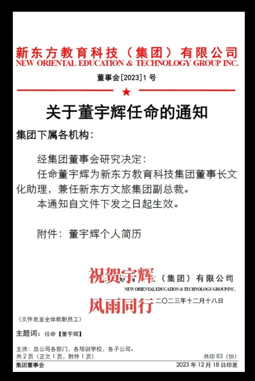 12月18日15:38,俞敏洪通過個人賬號公佈了對董宇輝的最新任命。