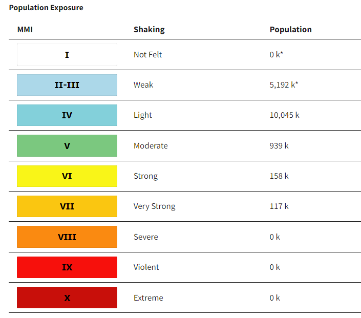 根據美國USGS的測算,此次地震遭受7級以上(Very strong)烈度的人口有11.7萬人。