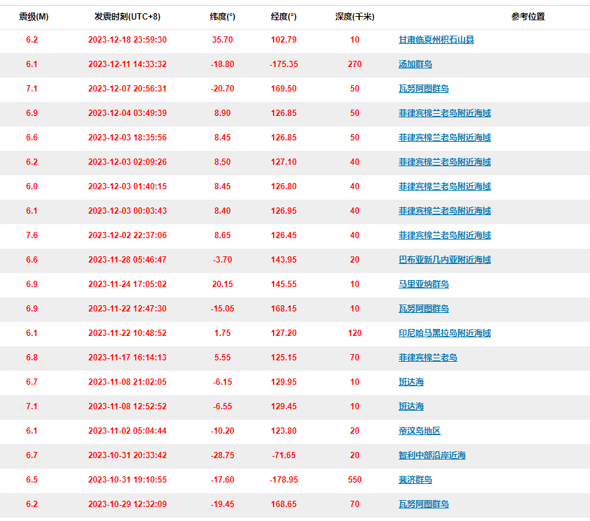 最近一次是10月中旬阿富汗發生的6.4級地震,震源深度10公里。