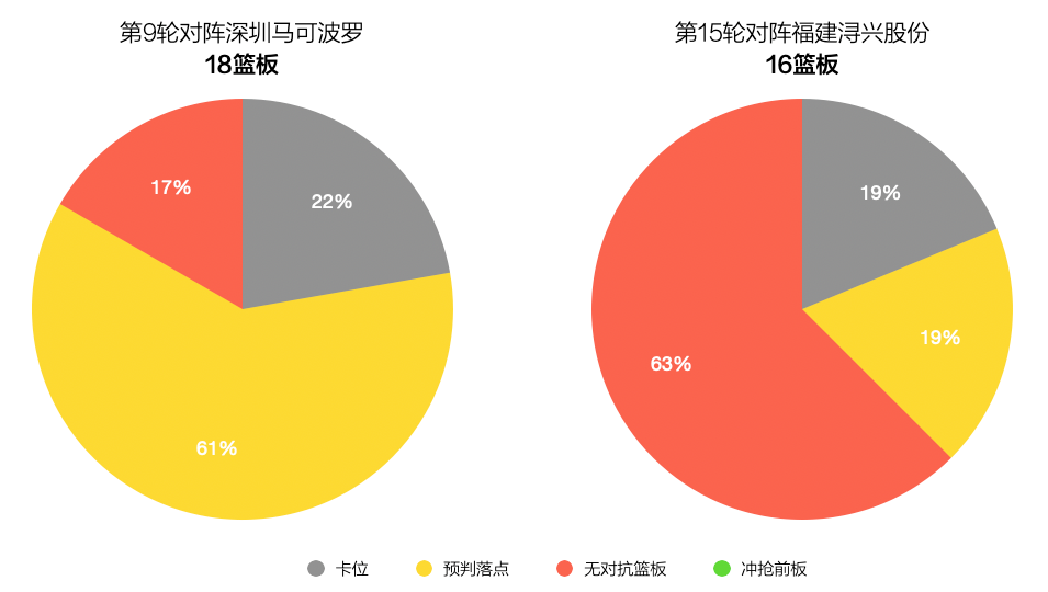 第一階段第9輪對陣深圳的比賽,阿不都沙拉木拿到了賽季至今最高的19個籃板(嚴格來説應該是18個籃板球,因為有一球其實是蓋帽,但技術台統計成了防守籃板)。而我們手動統計了阿不都沙拉木拿到這18個籃板球的方式,其中只有4個是利用卡位技術保護下來的,其餘的基本上都是通過預判球的落點或者無對抗的籃板。