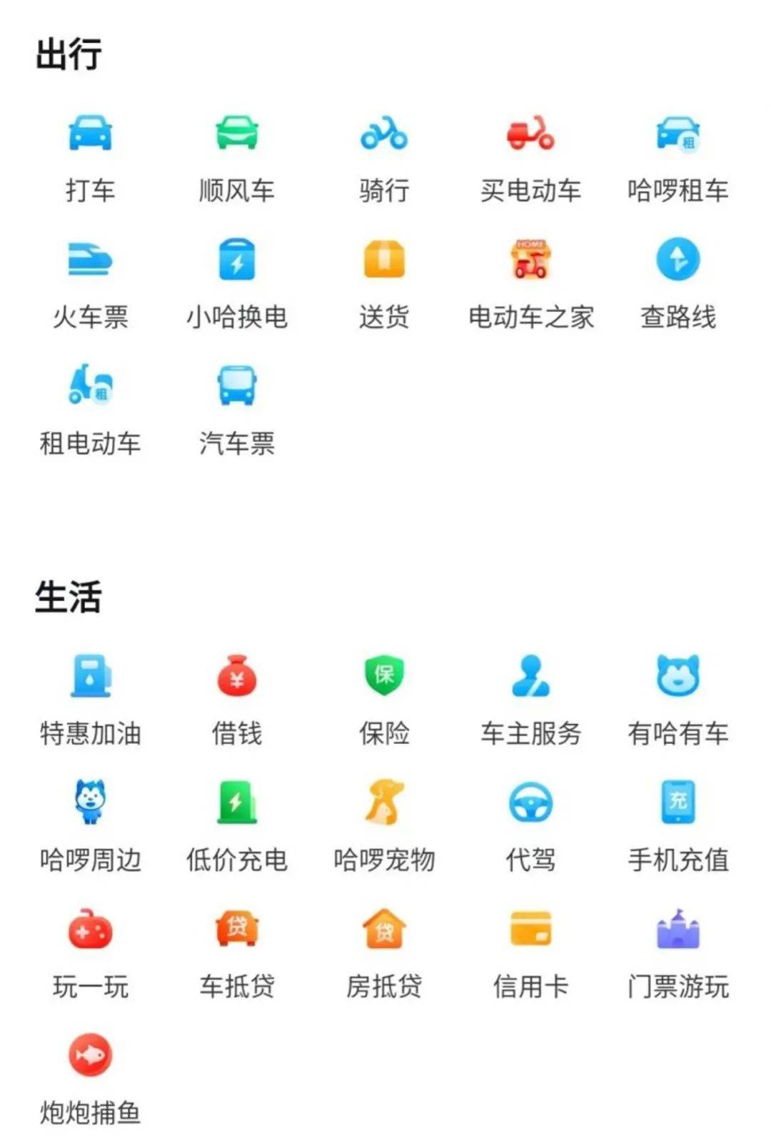 一方面,聚焦“出行”,從兩輪車騎行到四輪車,擴充了打車、租車、網約車等業務,增加購買電動車及周邊、租電動車、電動車換電、汽車票等業務。