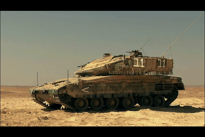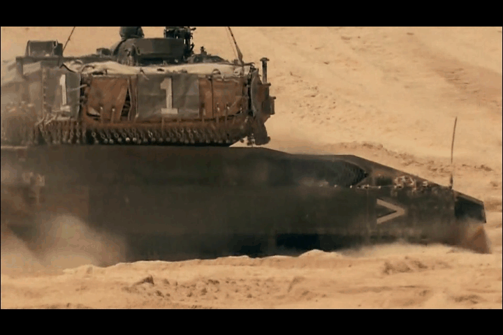 有兩名哈馬斯士兵鑽出地道,在灌木叢的掩護下接近一輛以軍“梅卡瓦”MK4坦克,其中一名士兵利用“梅卡瓦”坦克左後方的車長觀察盲區,先把一枚疑似反坦克火箭彈聚能戰鬥部的爆炸物塞到坦克的“戰利品”主動防禦裝置下面,然後拉開延時引信撤離。